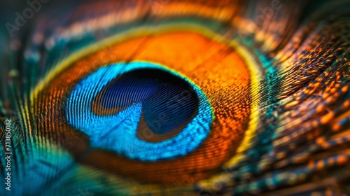 © Manyapha, Naklejka premium Vibrant detailed shot of a peacock feather. Emphasizing the iridescent colors and patterns, studio lighting.