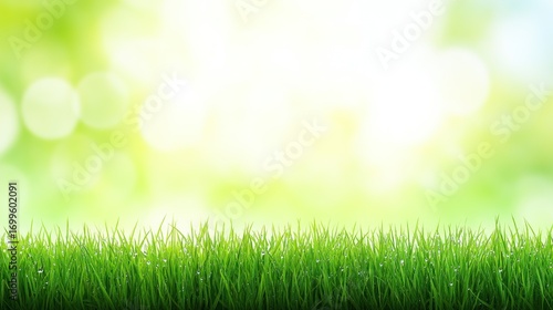 © Pakichwani, Obraz premium Vibrant Dew-Kissed Grass Blades Against a Soft-Focus Green Background