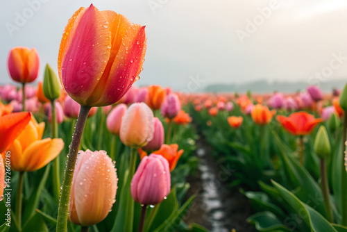 © Zahidul Creative, Naklejka premium Vibrant Dew-Kissed Tulips in a Spring Flower Field