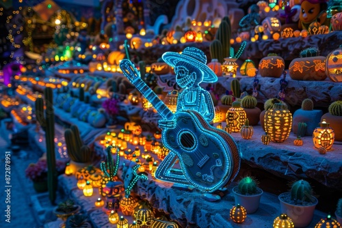 Fototapeta premium Vibrant Dia de los Muertos celebration with colorful lights and festive...