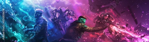 Fototapeta premium Vibrant digital art featuring three armored warriors in dynamic poses with futuristic and mystical elements in neon colors.