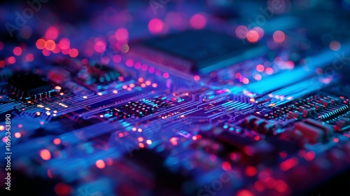 © Farah, Fototapeta premium Vibrant digital circuit board glows with electric blue and neon pink energy, symbolizing innovation and advanced technology.