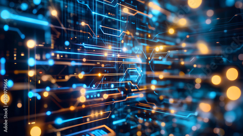 Obraz premium vibrant digital circuit board with glowing lines and nodes, representing technology and innovation. blue and orange lights create dynamic atmosphere