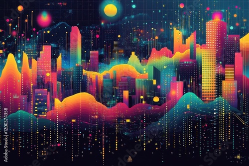 Obraz premium Vibrant Digital Cityscape Surrounded by Gradient Mountains and Abstract...