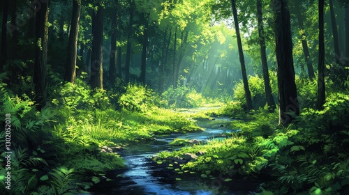 © AiPhotoSale, Naklejka premium Vibrant digital forest illustration; lush greens cascade under dappled sunlight filtering through majestic trees, casting serene shadows on sparkling streams below. Peaceful ambiance with thriving flo