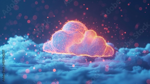 © Tackey, Naklejka premium Vibrant digital illustration of a glowing cloud with neon light effects, surrounded by a dreamy atmosphere, representing futuristic technology. 3D Illustration.