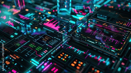 Obraz premium Vibrant digital interface with glowing graphs and data visualizations, ideal...