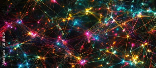 Fototapeta premium Vibrant digital network background with colorful lights in blue, pink, and yellow, creating a dynamic abstract composition of connectivity elements.