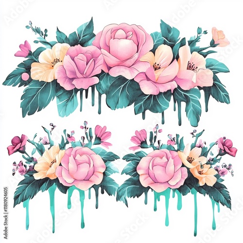 © heinng, Obraz premium Vibrant Digital Painting: Delicate Pastel Roses Dripping Colorfully. AI Generated