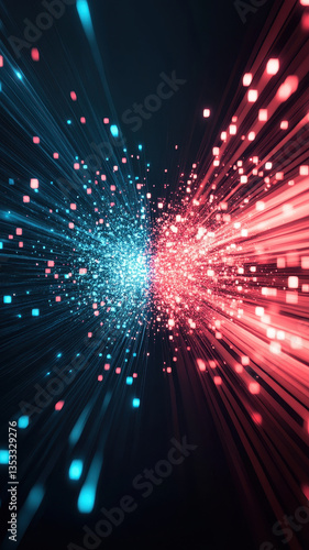 Naklejka premium Vibrant digital particles burst contrasting blue and red hues, creating dynamic visual effect that evokes sense of energy and movement. This abstract representation captures essence