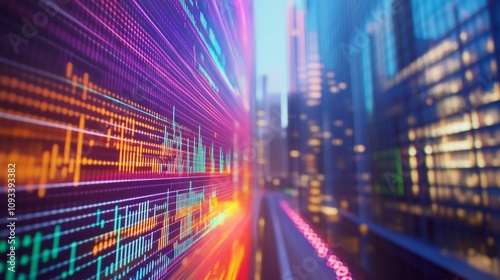 Fototapeta premium Vibrant digital stock market graph overlays futuristic cityscape, merging financial data with urban skyline in a dazzling display of technology and commerce.