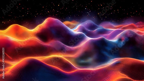 Fototapeta premium Vibrant digital wave landscape with glowing orange and blue neon lines...