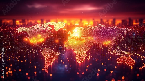 Fototapeta premium Vibrant digital world map illuminated by glowing lights against a sunset city...