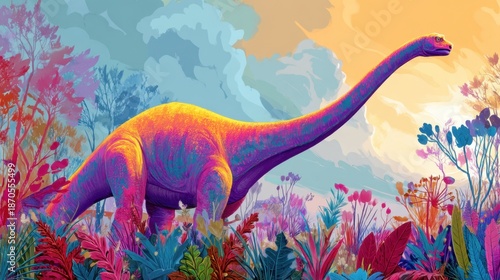 Fototapeta premium Vibrant dinosaur in colorful prehistoric landscape at sunset