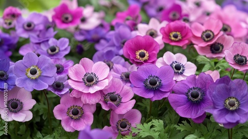 Fototapeta premium Vibrant display of anemones in shades of pink and purple showcasing their...