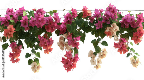 Fototapeta premium vibrant display of bougainvillea flowers in various shades. including pink. purple. and cream. cascading down with lush green leaves this arrangement is ideal for decorative purposes. enhancing garden