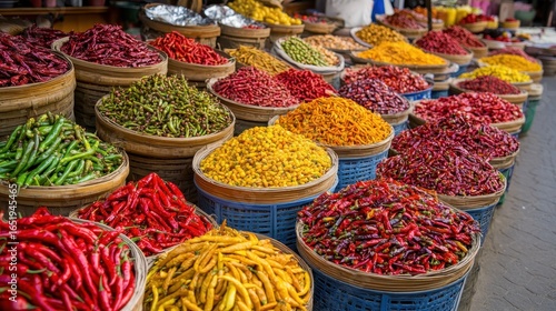 © Concept2Photo, Fototapeta premium Vibrant Display of Fresh Spices in Traditional Market Baskets