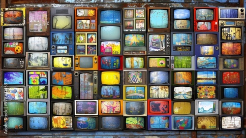 Fototapeta premium Vibrant display of televisions showcasing a variety of colorful broadcasts...