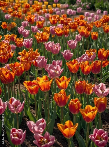 © Tamazina, Fototapeta premium Vibrant display of tulips in full bloom fills image, showcasing mesmerizing blend of colors, natural beauty. Flowers, basking under gentle embrace of sunlight.