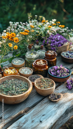 © Exsinghas, Fototapeta premium vibrant display of various herbs and flowers arranged rustic wooden table, showcasing bowls filled with dried herbs, jars of herbal mixtures, and colorful blooms. This serene setting evokes sense