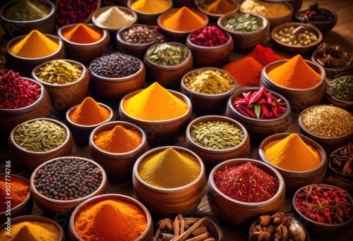Fototapeta premium vibrant display rare spices colorful containers showcasing rich array textures hues, herbs, seasonings, flavors, ingredients, jars, colors, aroma, exotic