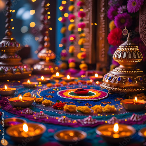 © Ali, Naklejka premium Vibrant Diwali Rangoli: Festive Lights and Decorations