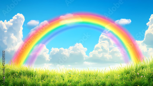 Naklejka premium Vibrant double rainbow over green fields. Rainbow Fields. Illustration
