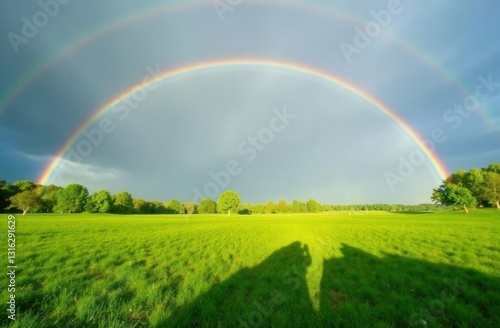 © Sergey, Naklejka premium Vibrant double rainbow over lush green field and trees in sunlit landscape