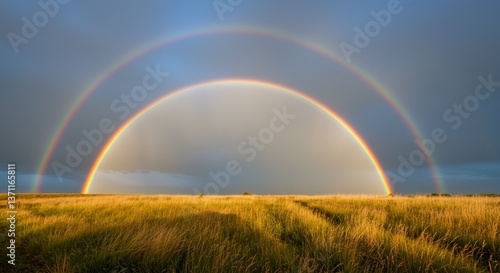Naklejka premium Vibrant double rainbow spanning a serene grassy landscape under a partly...