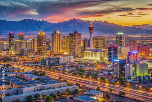 Obraz premium Vibrant downtown Las Vegas cityscape at dusk, featuring bright neon lights, sleek skyscrapers, and bustling streets surrounded by desert landscape and distant mountains.