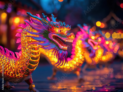 © Photo Graphic Stock, Obraz premium Vibrant dragon dance figures glowing in colorful patterns at night