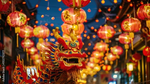 © Thuntaree, Fototapeta premium Vibrant Dragon Sculpture Surrounded by Festive Lanterns at Night