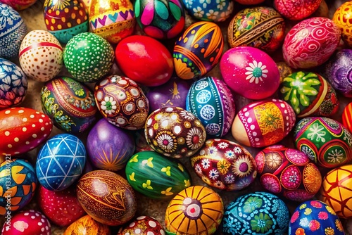© Danicha, Fototapeta premium Vibrant Easter Egg Background: Colorful Hand-Painted Eggs Top View Macro Shot