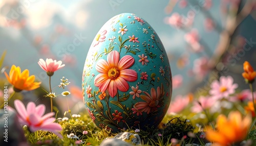 © nama, Fototapeta premium Vibrant Easter egg nestled in springtime meadow