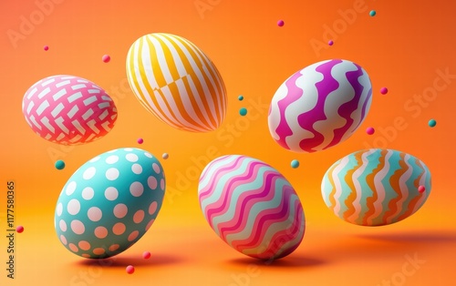 Fototapeta premium Vibrant Easter eggs in polka-dot and zigzag patterns floating on a vivid...