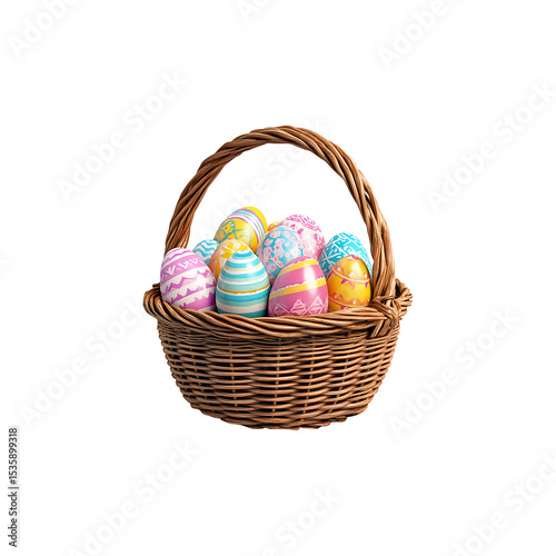 © MDRAKIBUL, Naklejka premium Vibrant Easter Eggs in Rustic Wicker Basket, Isolated on Transparent Background, png