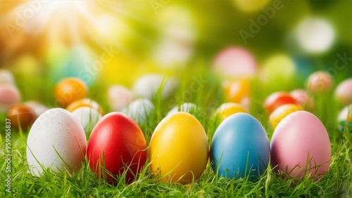 © Luminous Hub , Naklejka premium Vibrant Easter Eggs Resting on Fresh Green Grass