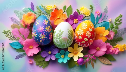 Fototapeta premium vibrant easter eggs with floral arrangement