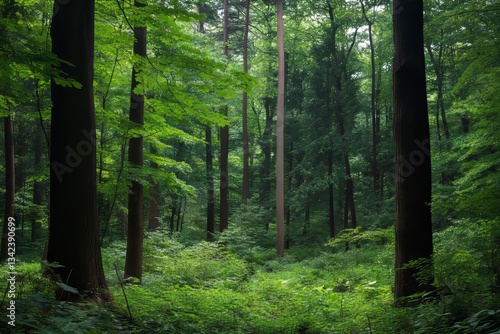 © Yevhen, Obraz premium Vibrant ecosystem of a natural forest filled with diverse flora and fauna in harmony
