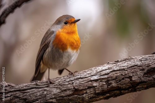 © RICH, Fototapeta premium Vibrant Eurasian Robin with orange-red throat perched on textured wooden branch in soft natural lighting.