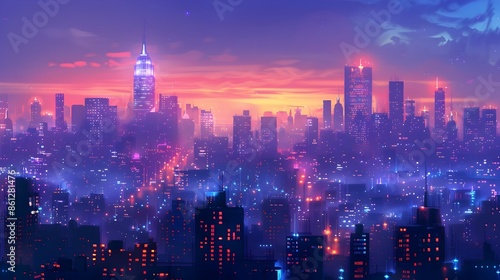 Fototapeta premium Vibrant Evening Cityscape with Glowing Skyscrapers and Streetlights Bustling...