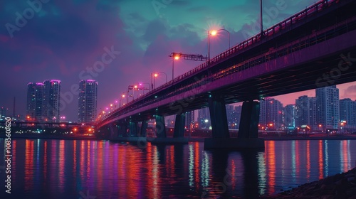 Naklejka premium Vibrant Evening Lights Over City Bridge