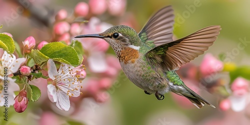 © Bay, Naklejka premium Vibrant feathers glisten in the light as a fairy bird flits gracefully among blooming flowers, embodying the essence of spring and the joy of flight
