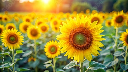 Fototapeta premium Vibrant field of blooming sunflowers under soft, natural light, with a blurred background, Sunflowers, vibrant, field, blooming