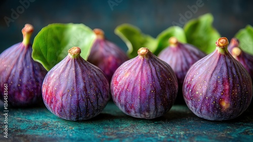 © Imagera, Obraz premium Vibrant figs with fresh green leaves against a textured background.