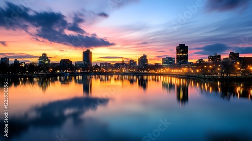 Fototapeta premium Vibrant firework display over a serene skyline, reflections glowing on water...