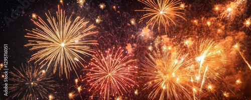 Naklejka premium Vibrant fireworks burst into brilliant colors, lighting up the dark night sky...