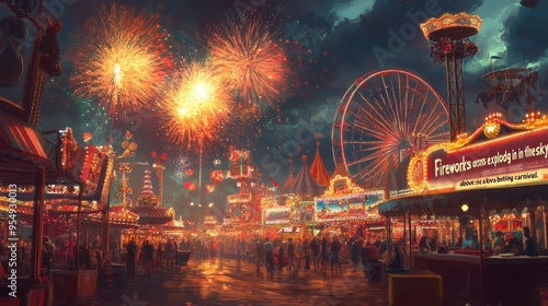 © Media Srock, Fototapeta premium Vibrant Fireworks Display at Carnival Fairground on a Lively Night