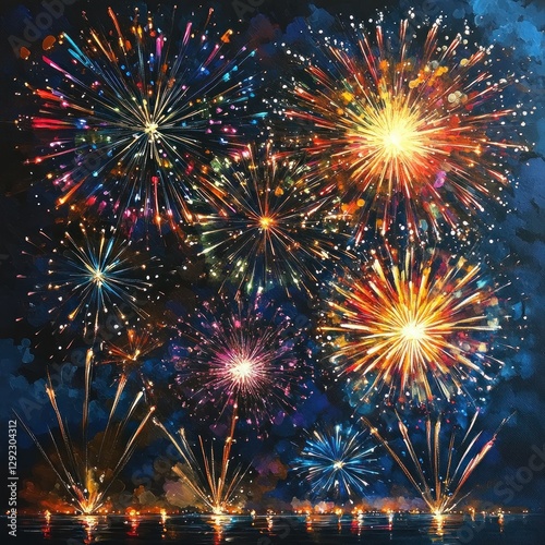 Naklejka premium Vibrant Fireworks Display in Impressionism Style with Colorful Explosions and Light Reflections in Dark Night Sky