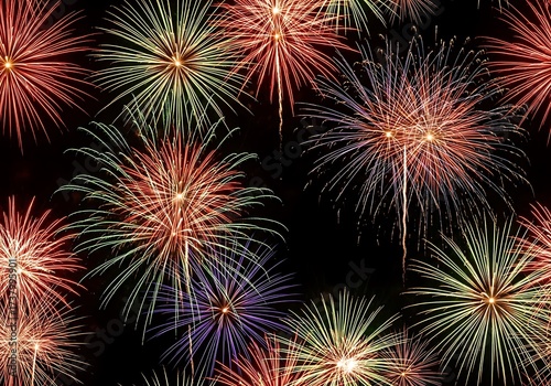 © Sahnaj, Naklejka premium Vibrant fireworks exploding in the night sky, celebrating holidays, festivals, and special events with dazzling light displays